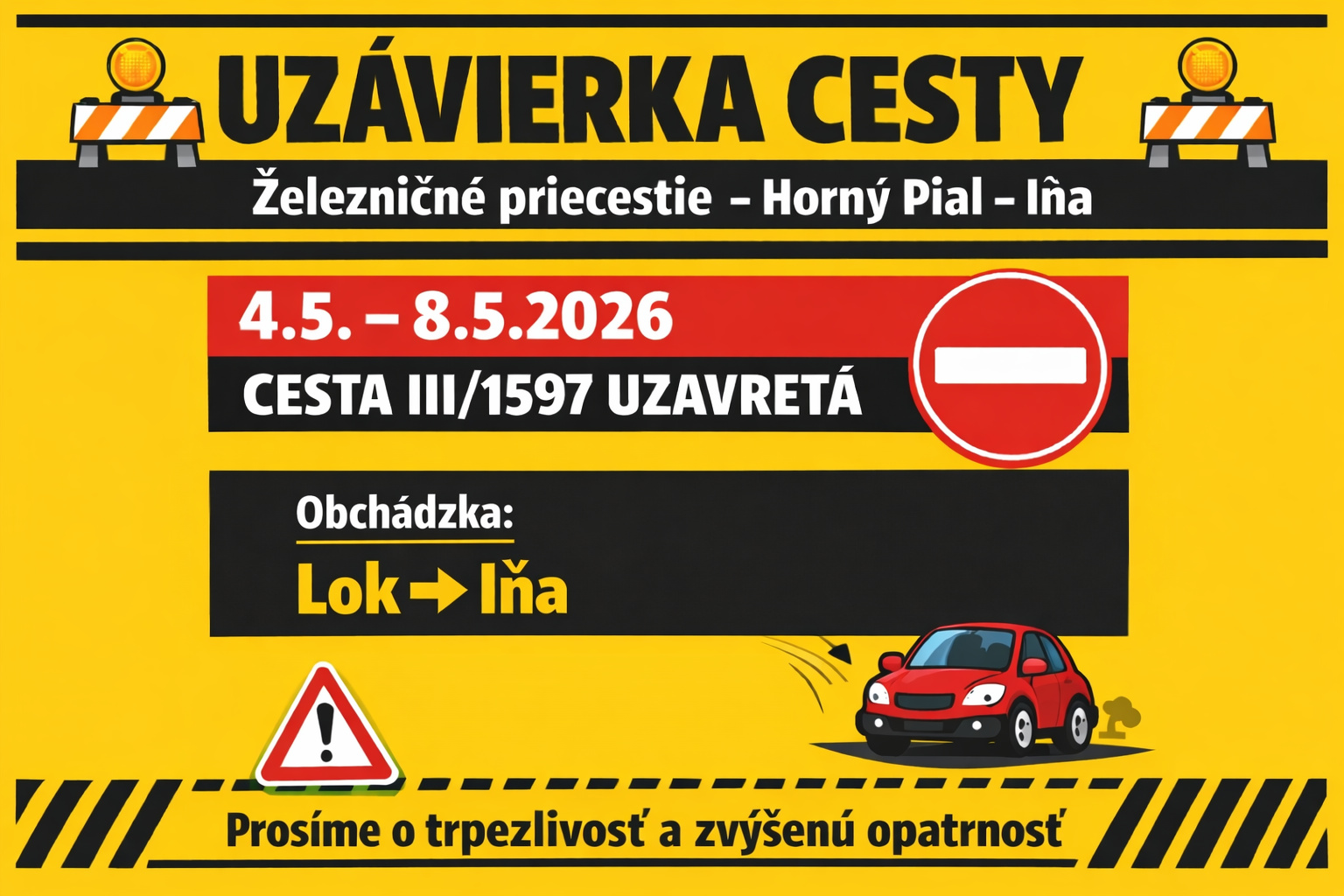 ⚠️ Žiadame všetkých vodičov o zvýšenú opatrnosť, rešpektovanie dočasného dopravného značenia a trpezlivosť počas trvania uzávierky.